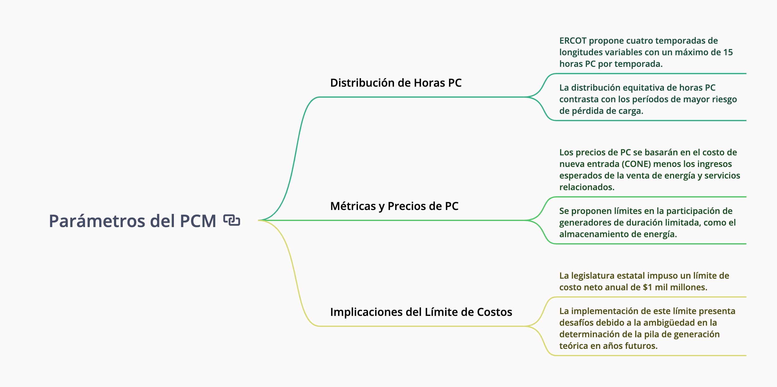La legislatura de Texas impuso un límite neto anual de $1,000 millones para los costos del PCM. Sin embargo, la implementación de este límite es un desafío debido a la dificultad de predecir el apilamiento teórico de generación en los años futuros.