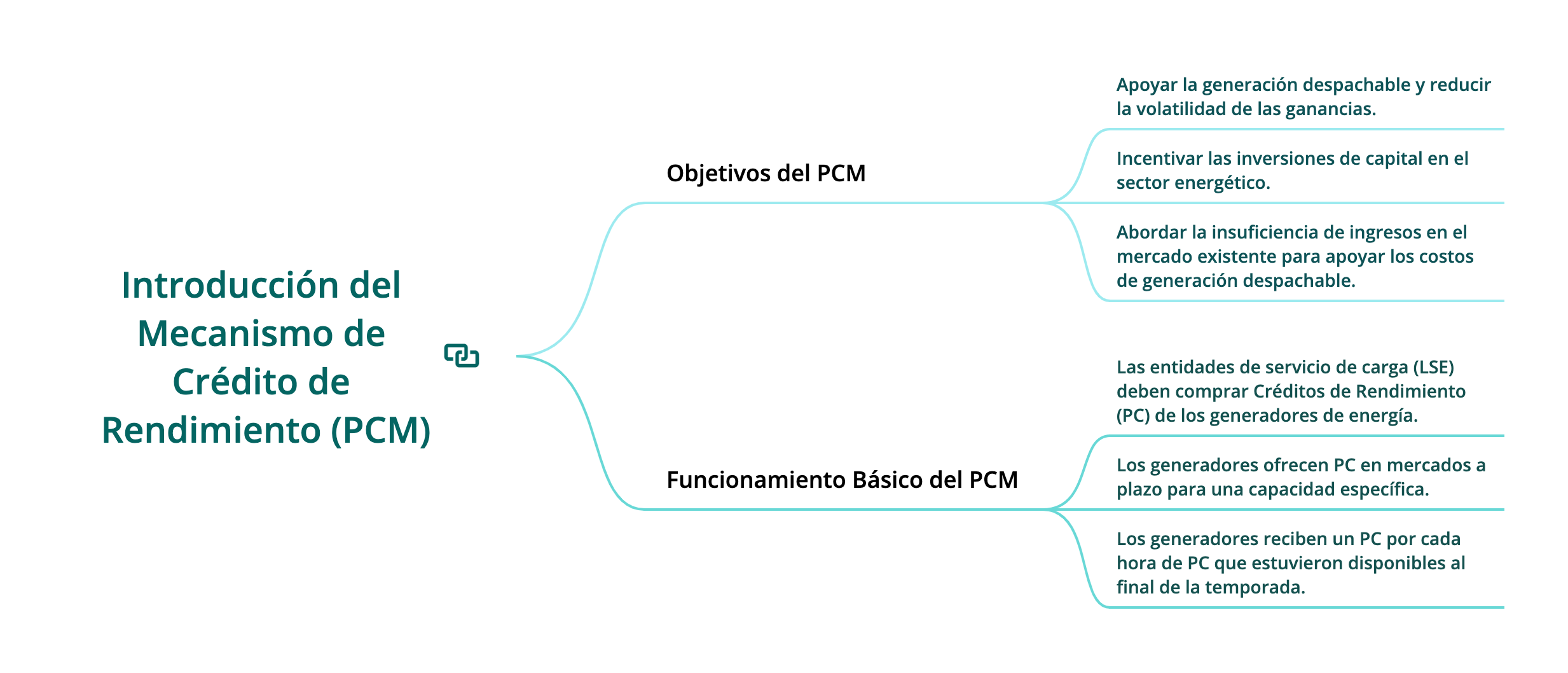 El PCM obliga a las entidades que suministran electricidad a los consumidores finales a comprar créditos de desempeño de los generadores, quienes se comprometen a estar disponibles durante las horas de mayor escasez de reservas de generación. Este enfoque busca resolver la insuficiencia de ingresos en el mercado existente para cubrir los costos de mantener la capacidad de generación necesaria para cumplir con el estándar de confiabilidad de una pérdida de carga de un día en diez años.
