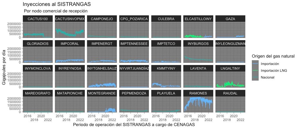 El SISTRANGAS tiene 28 nodos comerciales de inyección que son el origen de múltiples rutas de transporte gestionadas con decenas de contratos en base firme e interrumpible. Dichos contratos y sus atributos principales serán la materia de la entrega del día de mañana.