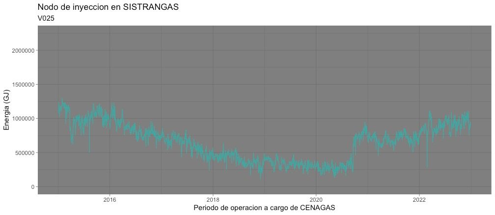 En lo que respecta a gas nacional, la producción combinada de los centros procesadores de Cactus y Nuevo Pemex aporta el mayor caudal en el nodo comercial V025. Un aspecto notable de este punto es su comportamiento decreciente con un repunte moderado de los últimos meses.